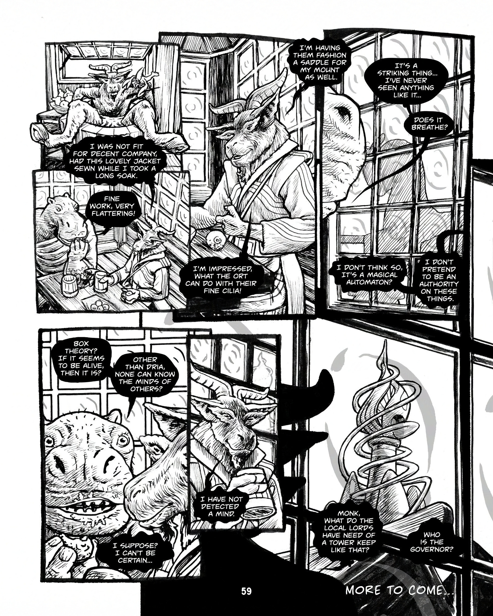 I didn’t do any rotations, just drew what felt right inventing it IN the story. When I wanted to make some changes in the next bit I partly masked it by them getting a bath and grooming at the Inn. But the model has drifted a lot. Was slowing me down trying to keep consistent, some angles were getting more and more challenging! The shapes were morphing and I didn’t have good rotational quarter views very well worked out. I decided I needed to model it.