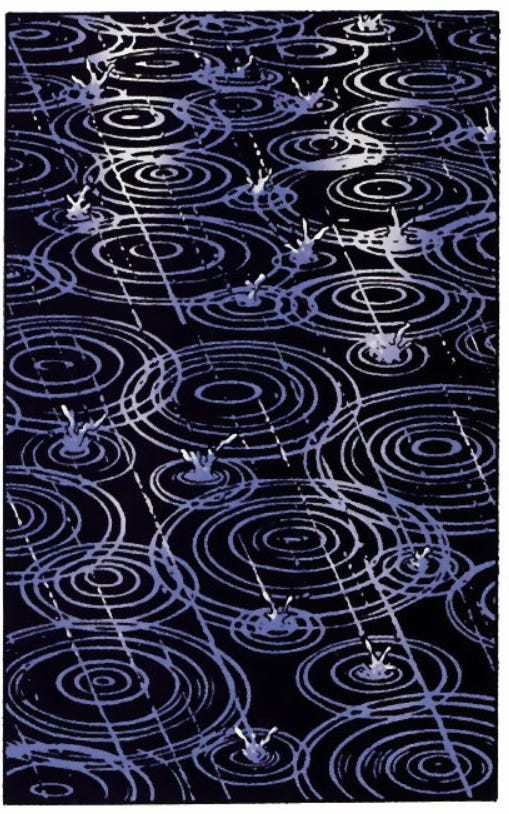 ”IN THIS FIRST PANEL, WE HAVE A TIGHT CLOSE-UP OF THE SURFACE OF A PUDDLE. (SEE? AND THERE WERE YOU ALL WORRIED THAT I WOULDN’T GIVE YOU ANYTHING FASCINATING TO DRAW.) WE ARE SO CLOSE TO THE PUDDLE AS TO SEE IT ONLY AS AN ALMOST ABSTRACT IMAGE OF WIDENING RIPPLES SPREADING ACROSS A SHADOWY AND BLACK LIQUID SURFACE. IT IS NIGHT TIME, AND THE RIPPLES THAT WE SEE IN THE FOREGROUND ARE CAUSED BY LARGE “