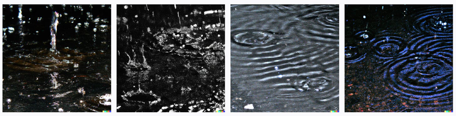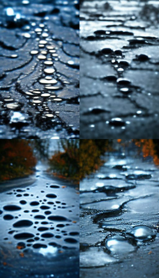 hmmm, how about “close up, surface of a puddle roadside, large droplets of rainfall in the foreground in sheets, hundreds of ripples spreading across each other, gutter side of the road, night time, we see one at the moment of impact with the puddle, freeze framed, mid November, bitterly cold--no sky”