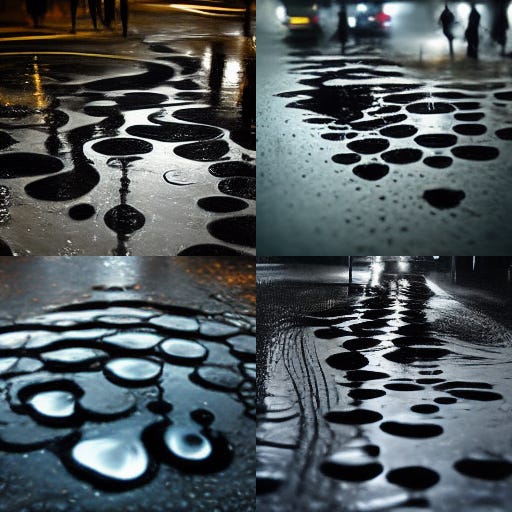 “heavy rain striking puddles close up, night time, many overlaping ripples radiating out over eachother, dark liquid on streets --no sky - “