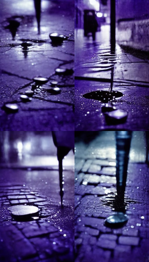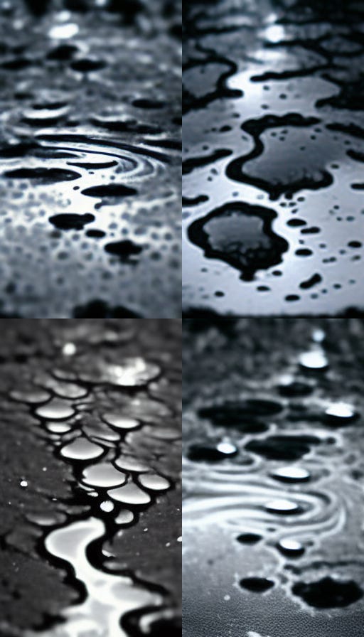 “--w 256 --h 448 tight close up, surface of a puddle, silvery white ripples spreading across a shadowy black liquid, night time, large droplets of rain fall through the foreground in diagonal slashes, we see one at the moment of impact with the puddle, so close to it, it’s mid november and bitterly cold--no sky”