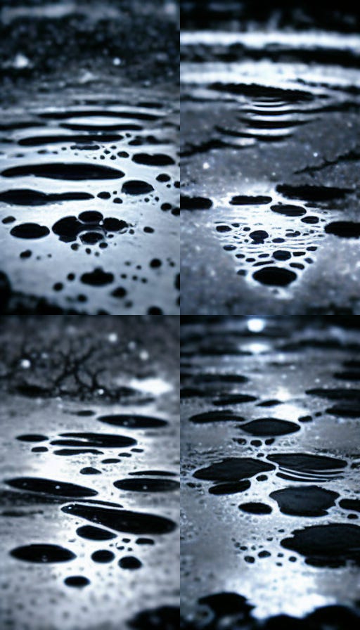 --w 256 --h 448 tight close up, surface of a puddle, silvery white many ripples spreading across a shadowy black liquid, night time. large droplets of rain fall in the foreground in heavy diagonal slashes. we see one droplet at the moment of impact with the puddle, so close to it, it’s mid november and bitterly cold--no sky -