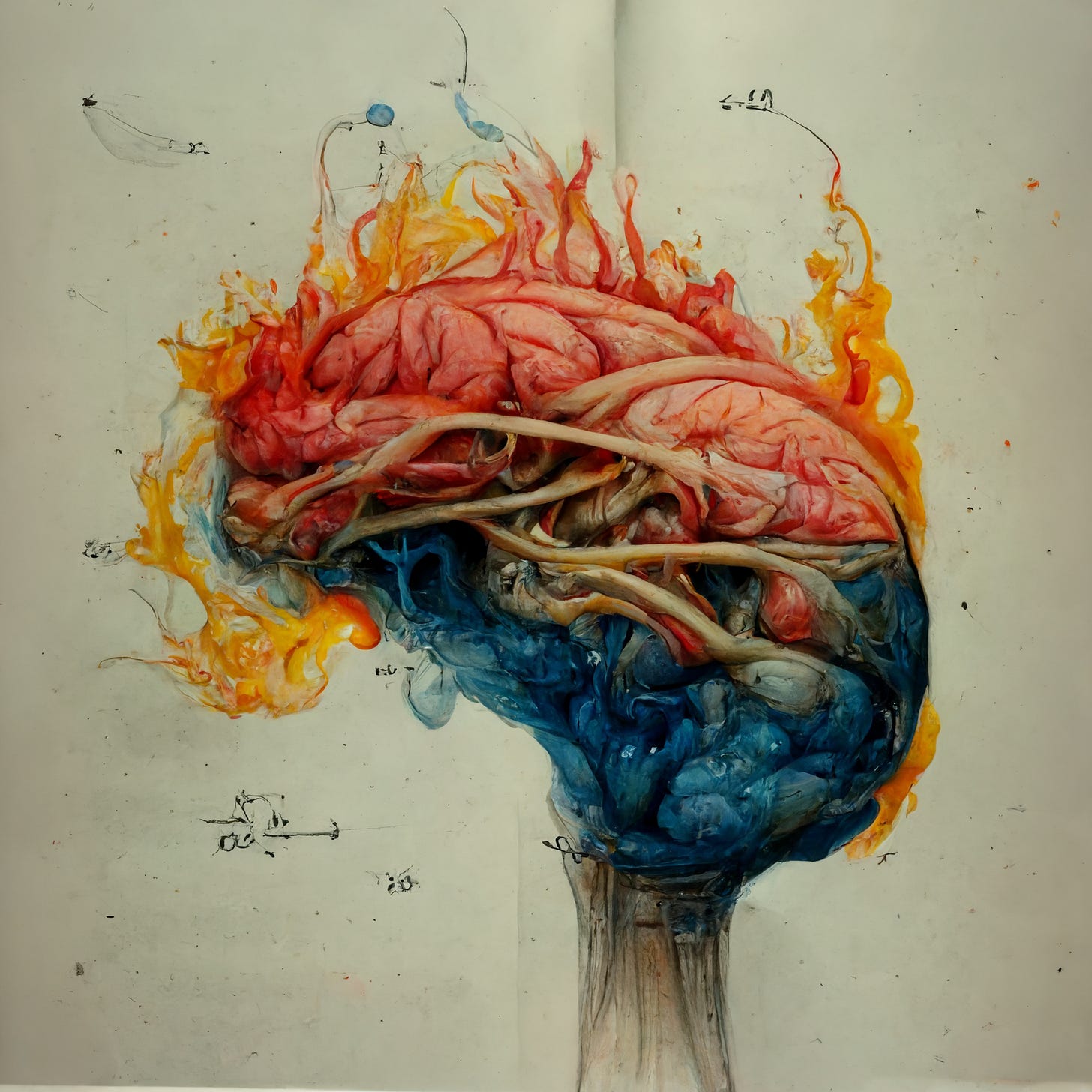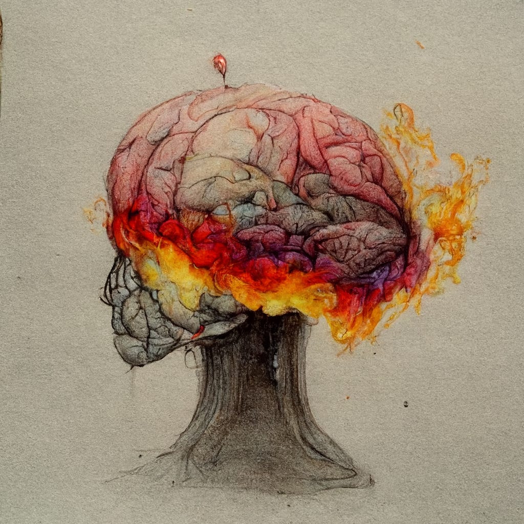 ”a diagram of a brain on fire with ideas done in pencil and watercolour”