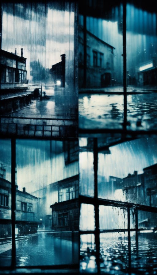 I didn’t have the patience frankly to get it all done, these are my attempts to get the first panel down, first with MidJourney where I used the —h ### and —w ### codes to get the right aspect ratio for the comic page. But getting it to give me graphic slashes of rain or something very clear probably would take a lot more fiddling. I both tried using Alan’s scrip directly, editing it down, and rewording it. I’ve noticed big differences depending on phrasing so was one of my first areas of exploration.